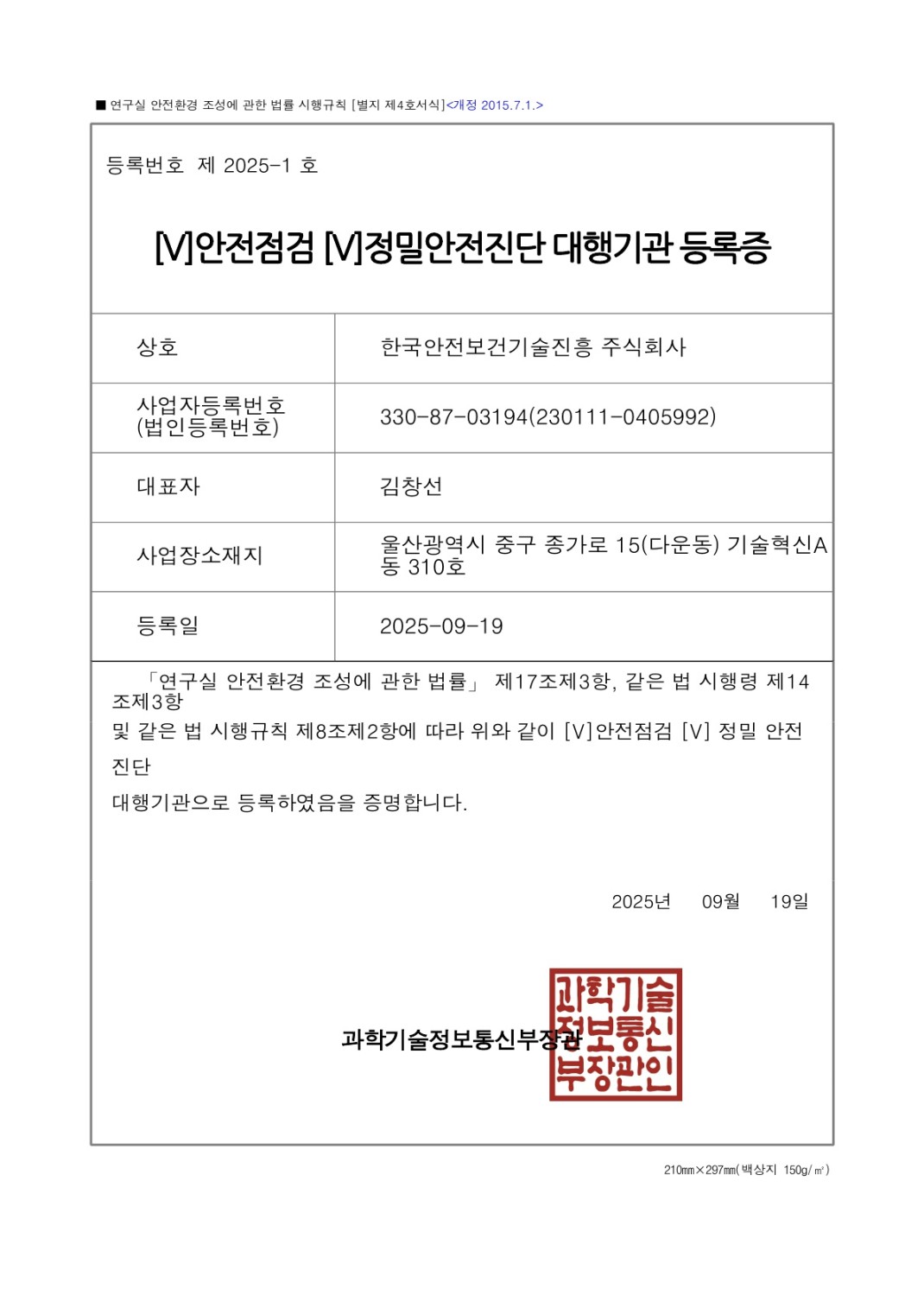 연구실 안전점검 및 정밀안전진단 대행기관 등록증